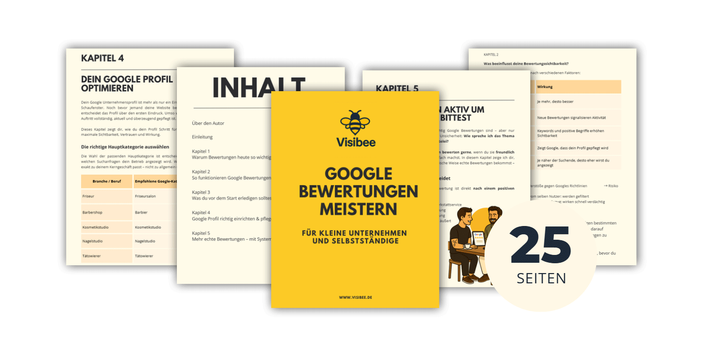 Perfekt. Dann hilft dir das E-Book, regelmäßig neue zu bekommen, auf Kritik souverän zu antworten und dein Profil besser zu pflegen – damit aus Bewertungen auch Kunden werden.